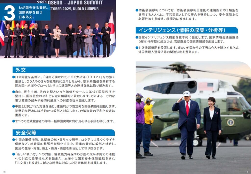 国家インテリジェンス機能を抜本的に強化します。国家情報会議設置法(仮称)を早期に成立させ、官邸直属の国家情報局を創設します。